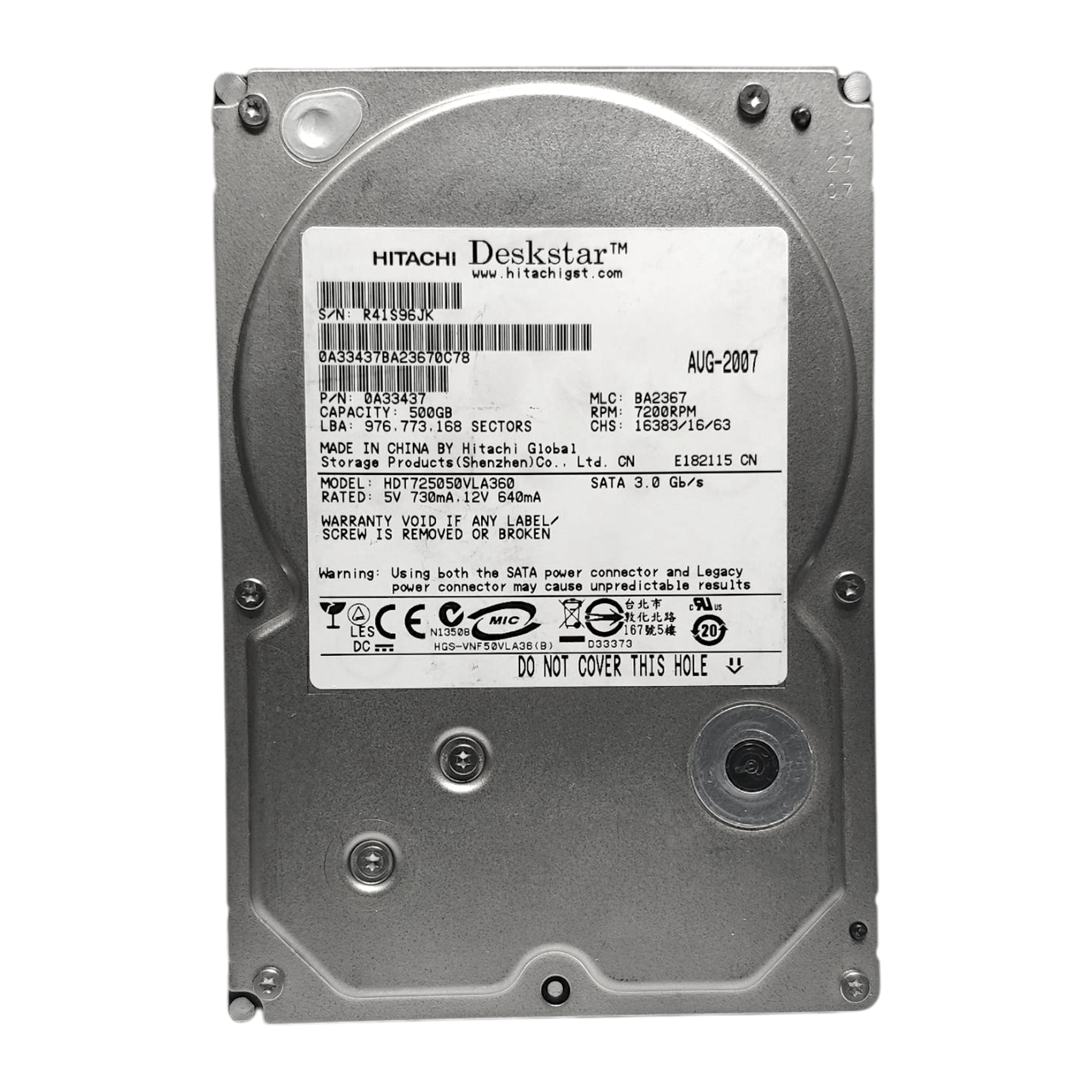 Жорсткий диск для комп'ютера 500GB 7200rpm 16MB SATA II 3.5" Hitachi Deskstar T7K500 HDT725050VLA360 0A33437 б/в (вживаний)